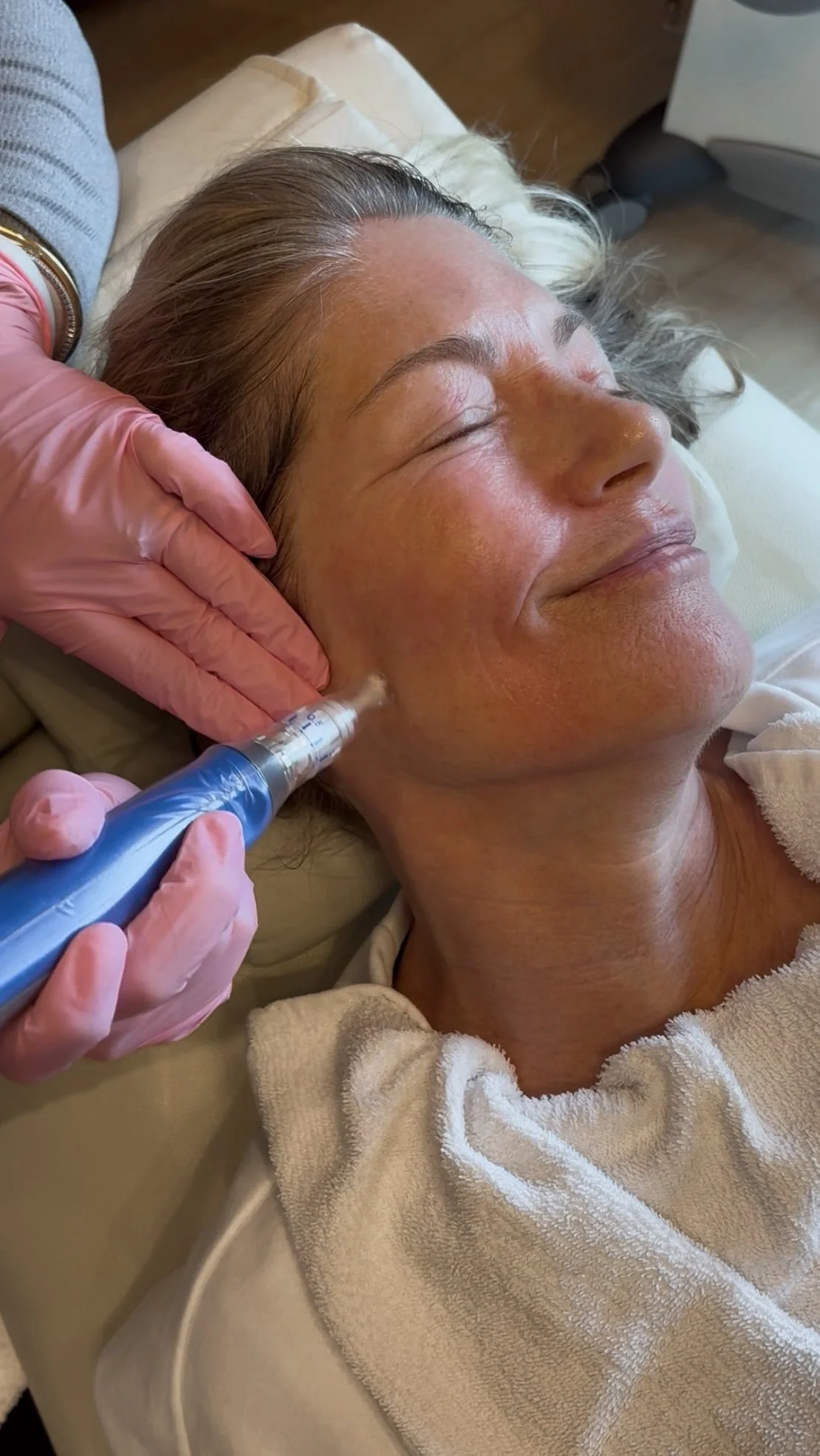 Microneedling uses tiny, controlled micro-injuries to trigger collagen and elastin production. It improves skin texture and reduces fine lines, scars, and enlarged pores.